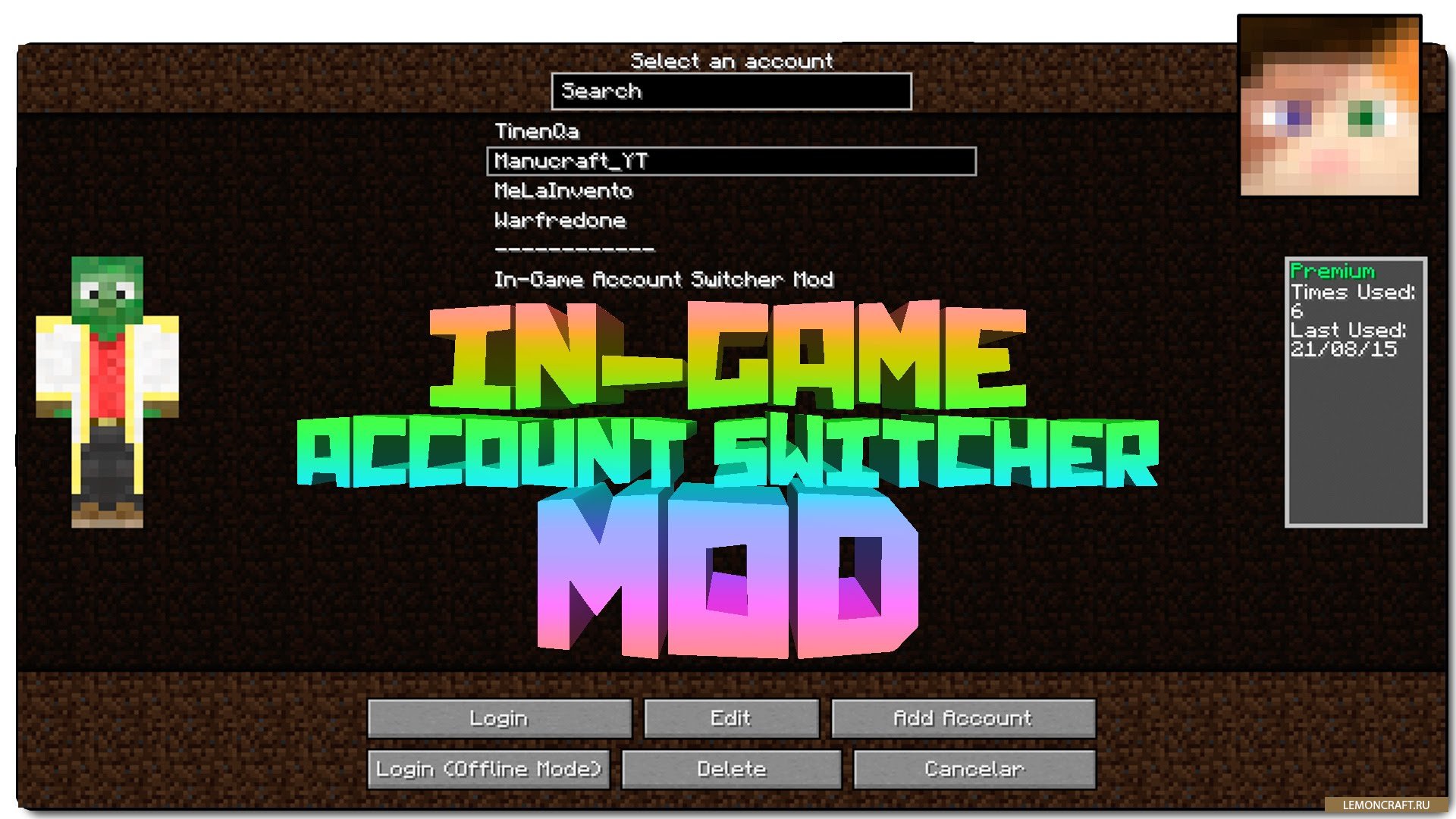 С помощью мода Ingame Account Switcher вы сможете сменить свои игровой аккаунт прямо в игре. После установки мода вам не нужно будет выходить, что бы потом войти под новым логином и паролем.